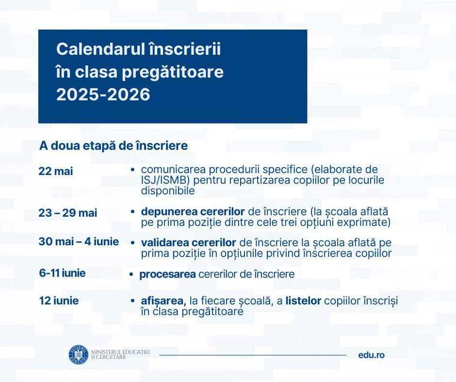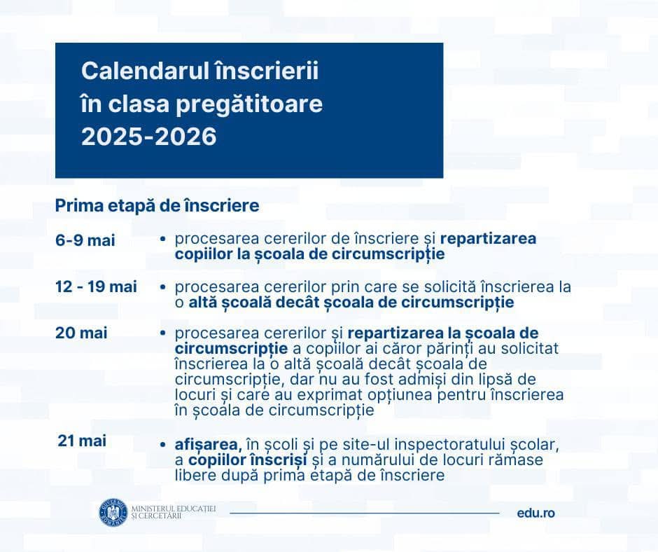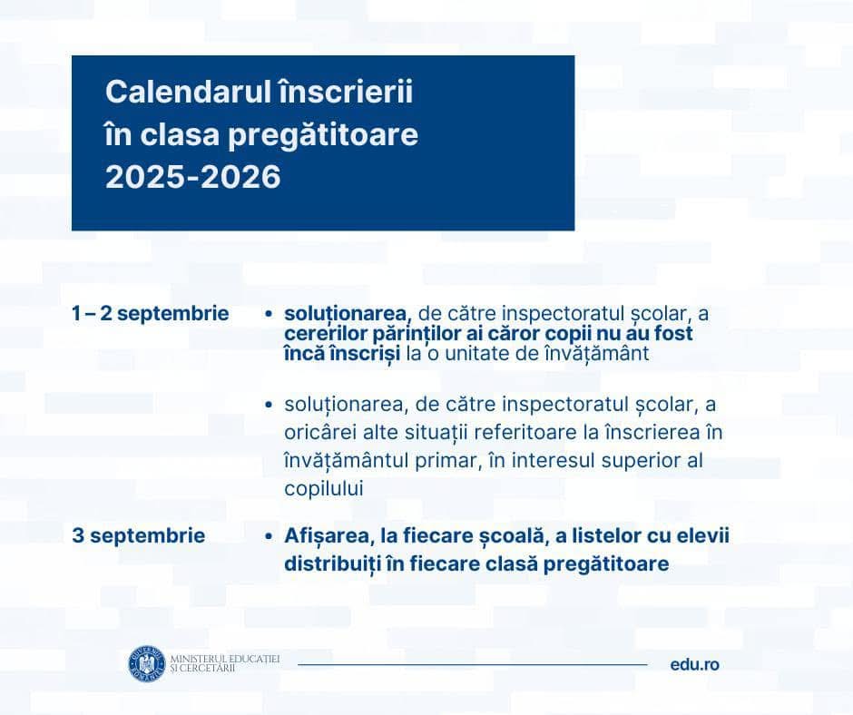 Copiii care împlinesc 6 ani până la 31 august 2025, inclusiv, trebuie să fie înscriși în clasa pregătitoare.