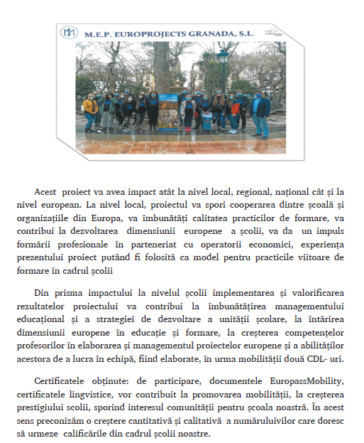 Ca urmare a participării în acest proiect, oferta educațională a școlii a fost mai bine fundamentată și centrată pe nevoile de dezvoltare a pieței muncii, locală, abandonul școlar la nivelul claselor terminale a înregistrat scăderi semnificative. A crescut rata de absolvire, precum și rata de inseție pe piața muncii.