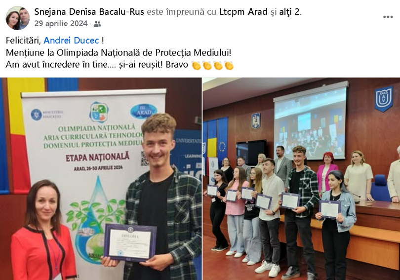 Elevii din grupul țintă au obținute premii și mențiuni: Locul II – la Olimpiada națională din aria curriculară Tehnologii – domeniul Construcții, aprilie 2022, la Miercurea-Ciuc; Mențiune – la Olimpiada națională din aria curriculară Tehnologii – domeniul Protecția Mediului, aprilie 2024.